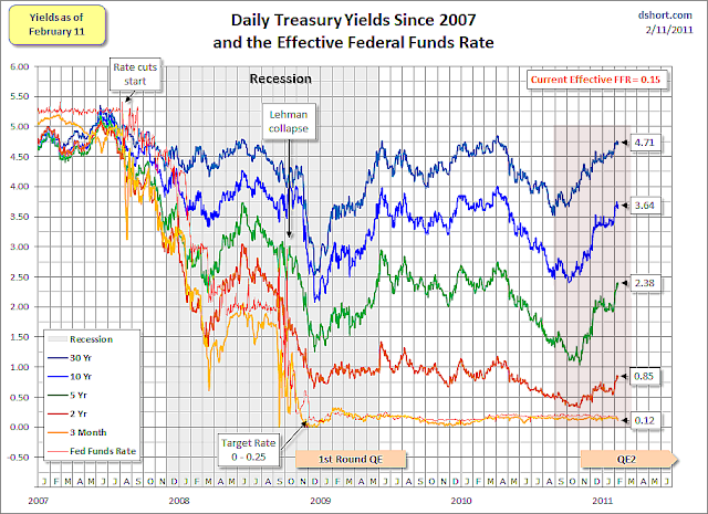Notice that all Treasury maturities have increased in yield since the Autumn of last year except for bills. Since the Fed has been buying two-to-five year Treasuries as part of QE2, the implication is that the Fed has no control over the debt- pricing process. The Fed’s rationale for quantitative easing in the first place was to force longer- maturity Treasury yields lower. Obviously, the Fed has failed.