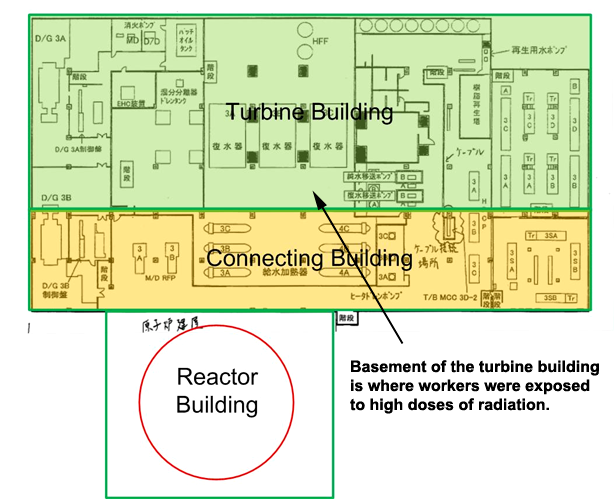 Six sievert is a lethal dose of radiation. The turbine building is adjacent and attached to the main reactor buildings: