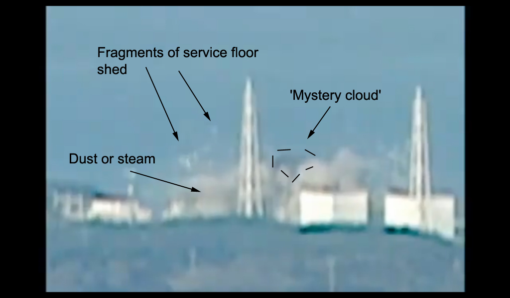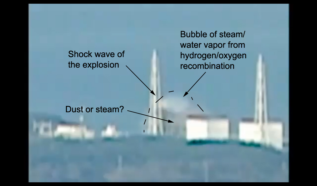You can see in the video an instant flash of white steam blasting upward. In Figure 2 the white steam or vapor bubble is rising from the roof of reactor 1, probably through a tear in the roof or where it had been blasted apart. This is the hydrogen explosion: the recombination of that gas and the oxygen in the air within the containment. When hydrogen ‘burns’ it turns to water in the form of very energetic steam.