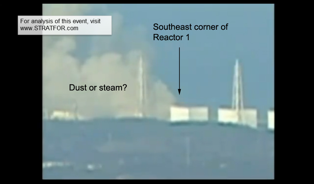 Other than the steam bubble, the rapidly expanding cloud atop reactor 1 is ambiguous as to whether it is dust or steam. It is hard to tell by looking at the video to this point: