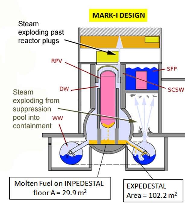 I believe it is likely that this reactor suffered a complete meltdown of the fuel into the pressure vessel with molten fuel coming into contact with water at the bottom of the vessel or in the suppression pool. This meeting would instantly generate a flash of live steam with explosive power equal to the amount of energy the fuel has available to transfer to the water. If the core is critical — that is, making chain reactions — the energy available could be several megawatts.