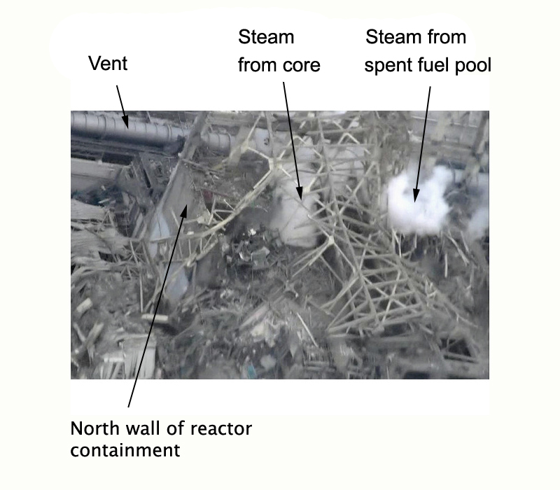 Prof. Dalnoki-Veress arrives at a meltdown conclusion from a different analytical starting point. He wants to find out if a full meltdown would explain the quantity of 38Cl radiation reported by TEPCO at a water discharge tunnel (it doesn’t, more reactions are needed). His premise indicates fuel burning through the bottom of the core would reach water in the bottom of the pressure vessel or suppression pool.