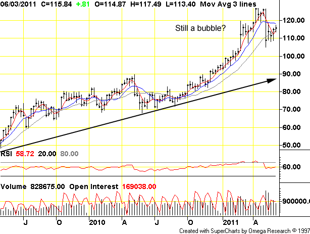 You have to wonder whether crude is a commodity bubble supported by finance credit/margin and ‘enthusiasm’? Right now it is hard to say because people like oil products and will buy them if they have cash. Crude is still trending sideways after breaking from a high. If the price was below $90 or over $130 a barrel it would be easier to make a call. The market looks to chop along sideways for awhile before a new trend emerges. Neither a steep decline or a bolt upward in demand are out of the question. Will the cost of fuel reflect the end of QE? Who knows?