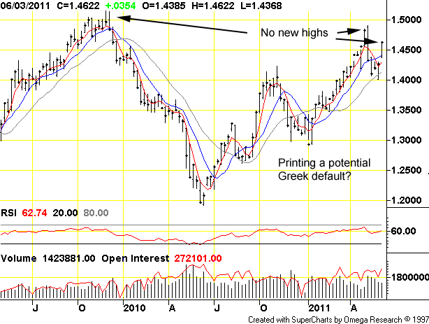 Despite all the sturm and drang, the euro never made new highs, either in the intermediate- or shorter term. Traders cannot tell whether a Greek default and quick exit from the currency union means a stronger euro/deutschmark in drag or a weaker one … or no euro at all! What happens next? Who knows?