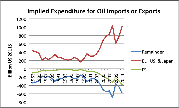Figure 1. A rough calculation of expenditure (in 2011$) associated with oil imports or exports, based on 2012 BP Statistical Review data, for three areas of the world: the Former Soviet Union (FSU), the sum of EU-27, United States, and Japan, and the Remainder of the World. (Negative values are revenue from exports.)