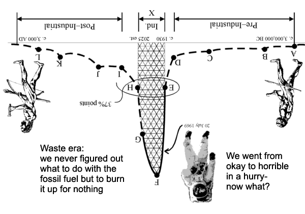 Richard Duncan’s original, 1995 conceptualization of the rise and fall of industrialization. We are what we consume per-capita sez Richard. This is completely paradoxical: we have created for ourselves a petroleum-driven dark age that we have but the smallest chance of escaping! The problem isn’t the primitive, it is our mis-managed progress. Propaganda pimps modernity as the race toward a scarcely-to-be-believed wonderland of Chinese made crap consumer goods sure to arrive tomorrow. The record of one industrial failure after another speaks for itself: if we are done in it will be on account of our stupendous successes revealed as the follies they turned out to be.