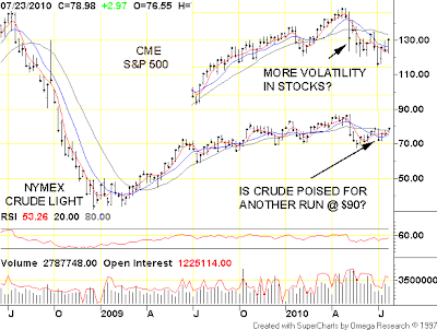 Here is the NyMex front month weekly chart with the S&P 500 weekly superimposed:
